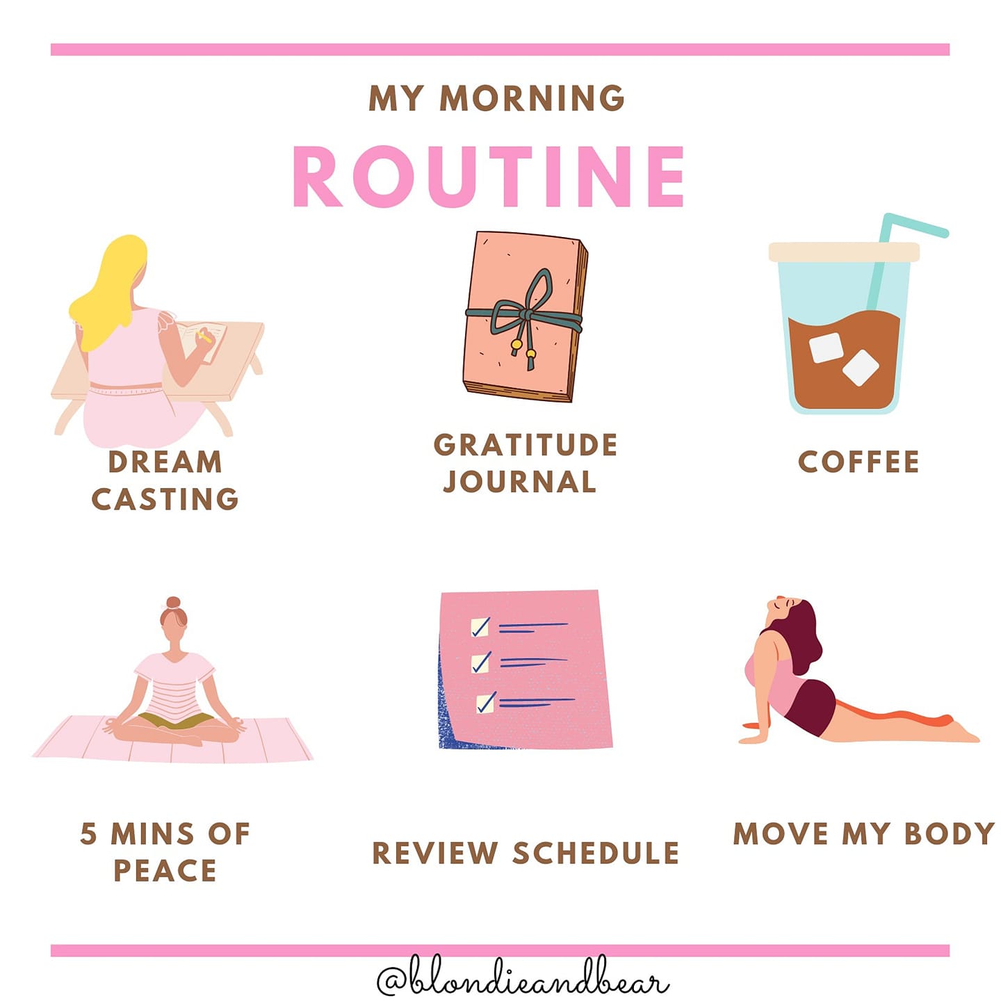 Here’s a snap shot of what my morning routine looks like: